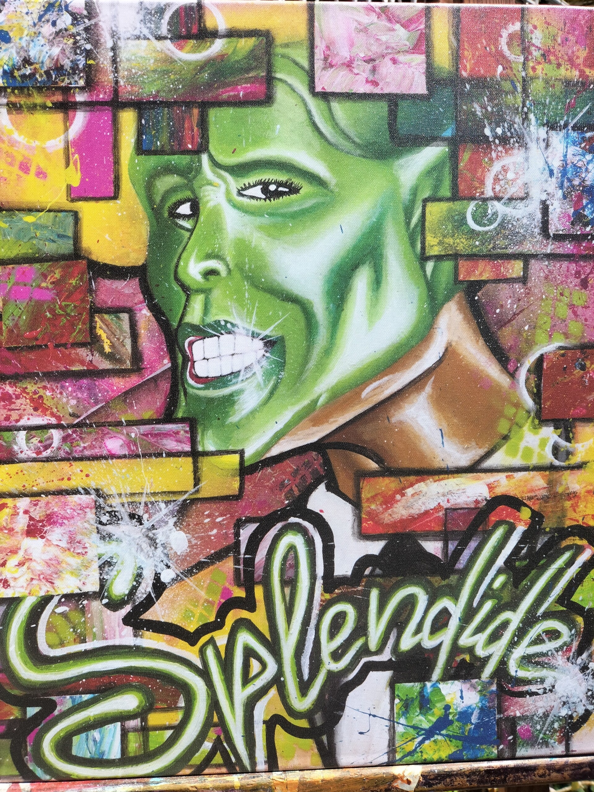 Le personnage central, inspiré de "The Mask", est l'élément le plus frappant. Son grand sourire charmeur et son expression qui semble presque prononcer le mot "Splendide" donne un côté ludique et exubérant à l'œuvre. Habillé de son costume et son chapeau jaune rappelle le style iconique du personnage.