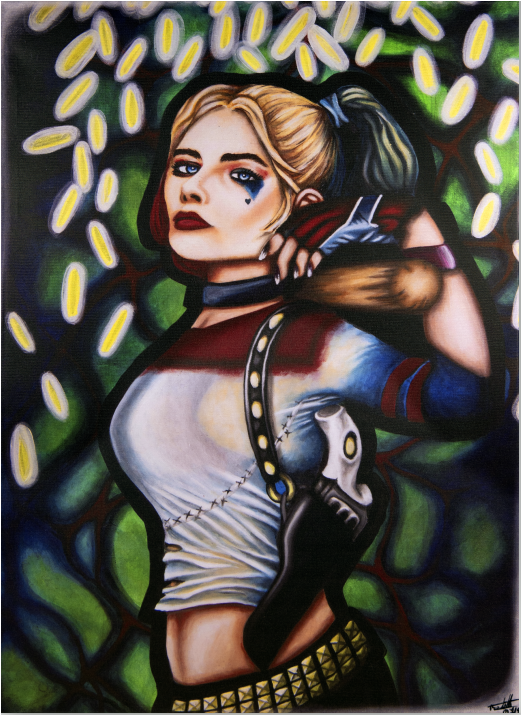 Ce tableau intrigant mélange harmonieusement l'abstrait et le figuratif, mettant en scène une représentation stylisée de Harley Quinn.