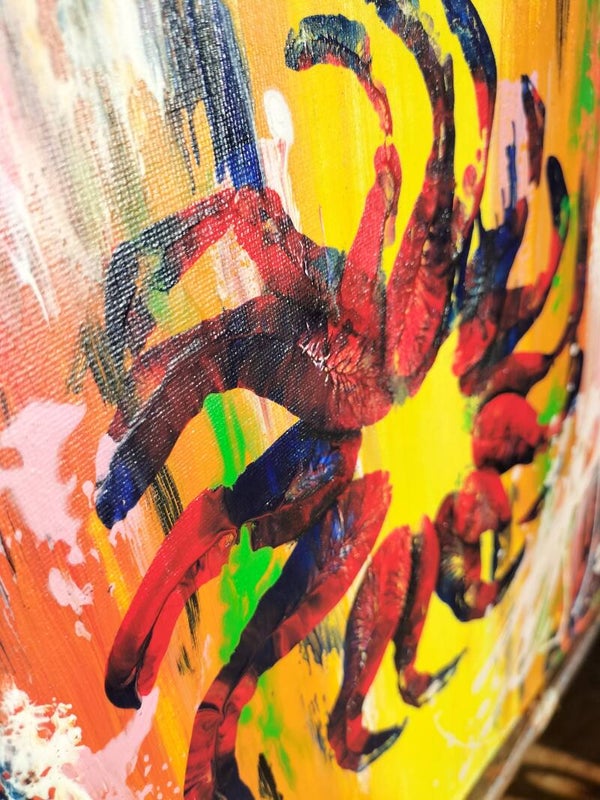 Le fond en dégradé rouge-orange-jaune évoque une sensation de chaleur intense, presque solaire, et le jaune lumineux au centre attire immédiatement le regard, comme une explosion d’énergie. L'ajout du bleu nuit et du vert, appliqués au couteau, crée un contraste saisissant, apportant de la profondeur et un effet presque tourbillonnant.